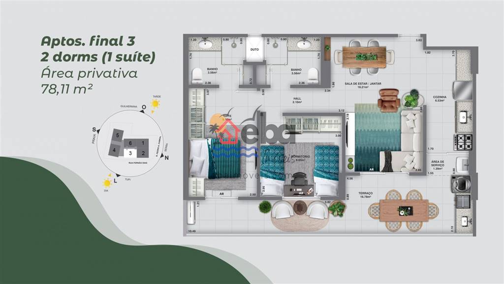 Apartamento será espaçoso com 78m² em dois dormitórios, sendo uma suíte,cozinha americana integrada com a generosa Sala para dois ambientes com varanda gourmet. Arejado, lado do nacer e Sol da manhã.